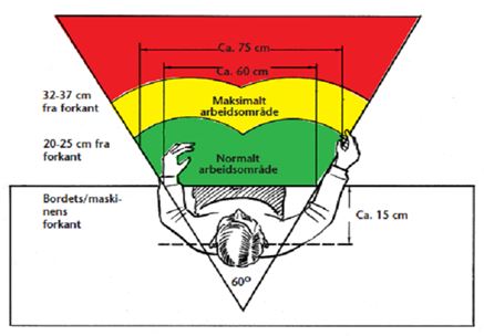 Ved sittende arbeid bør vurderingen av arbeidsstillingen også ta hensyn til hendenes avstand fra kroppen (rekkeavstanden). Anbefalt rekkeavstand for arbeidstaker ved sittende arbeid:
