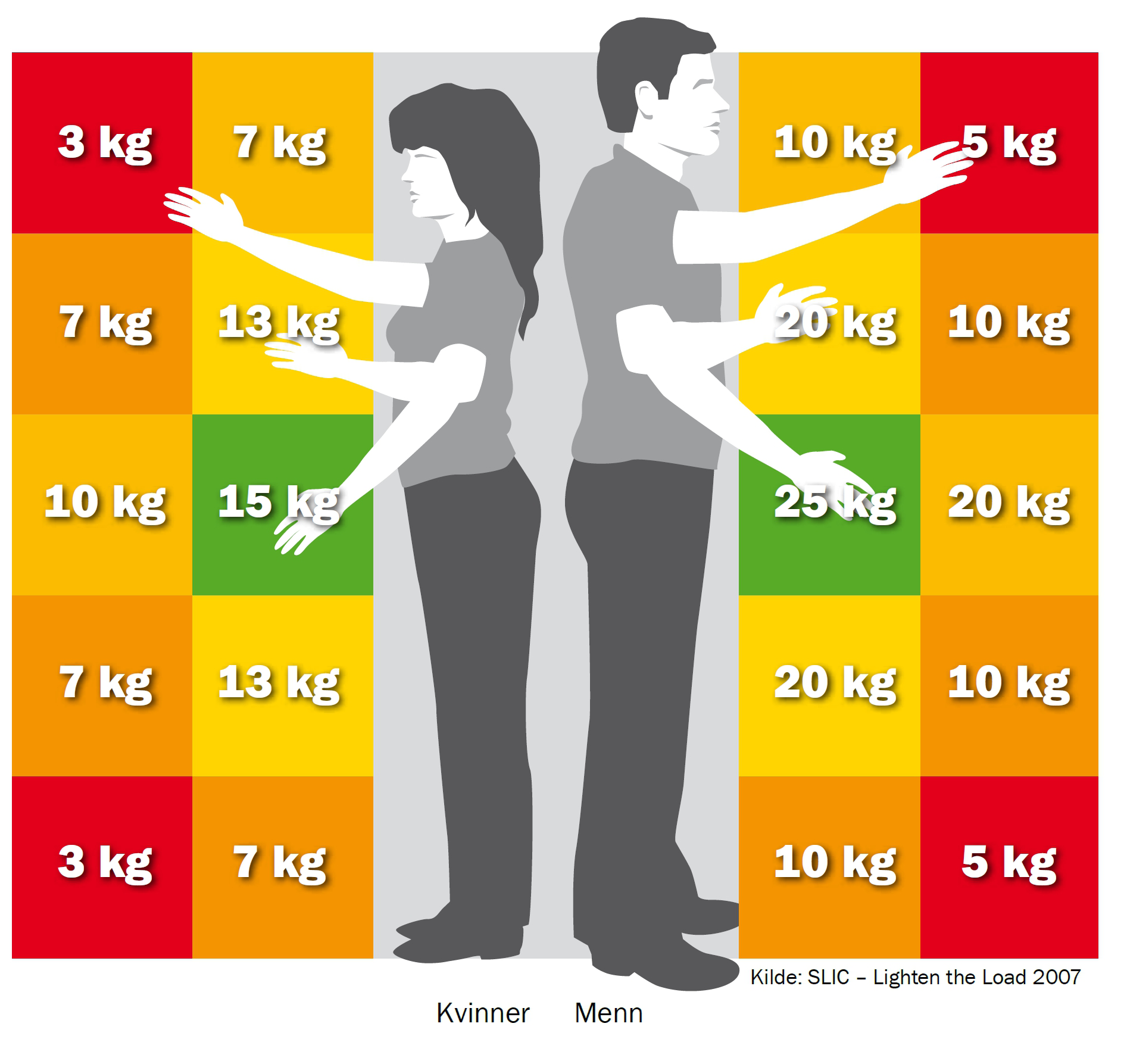 Ved arbeid i stående stilling må man også ta hensyn til avstanden fra kroppen (rekkeavstanden). Vurderingsmodellen viser anbefalte grenser for vurdering av gjenstandens vekt sammenlignet med avstanden fra kroppen. Grensene er basert på belastning på korsryggen. Vekten er angitt loddrett. Rekkeavstanden er angitt vannrett.